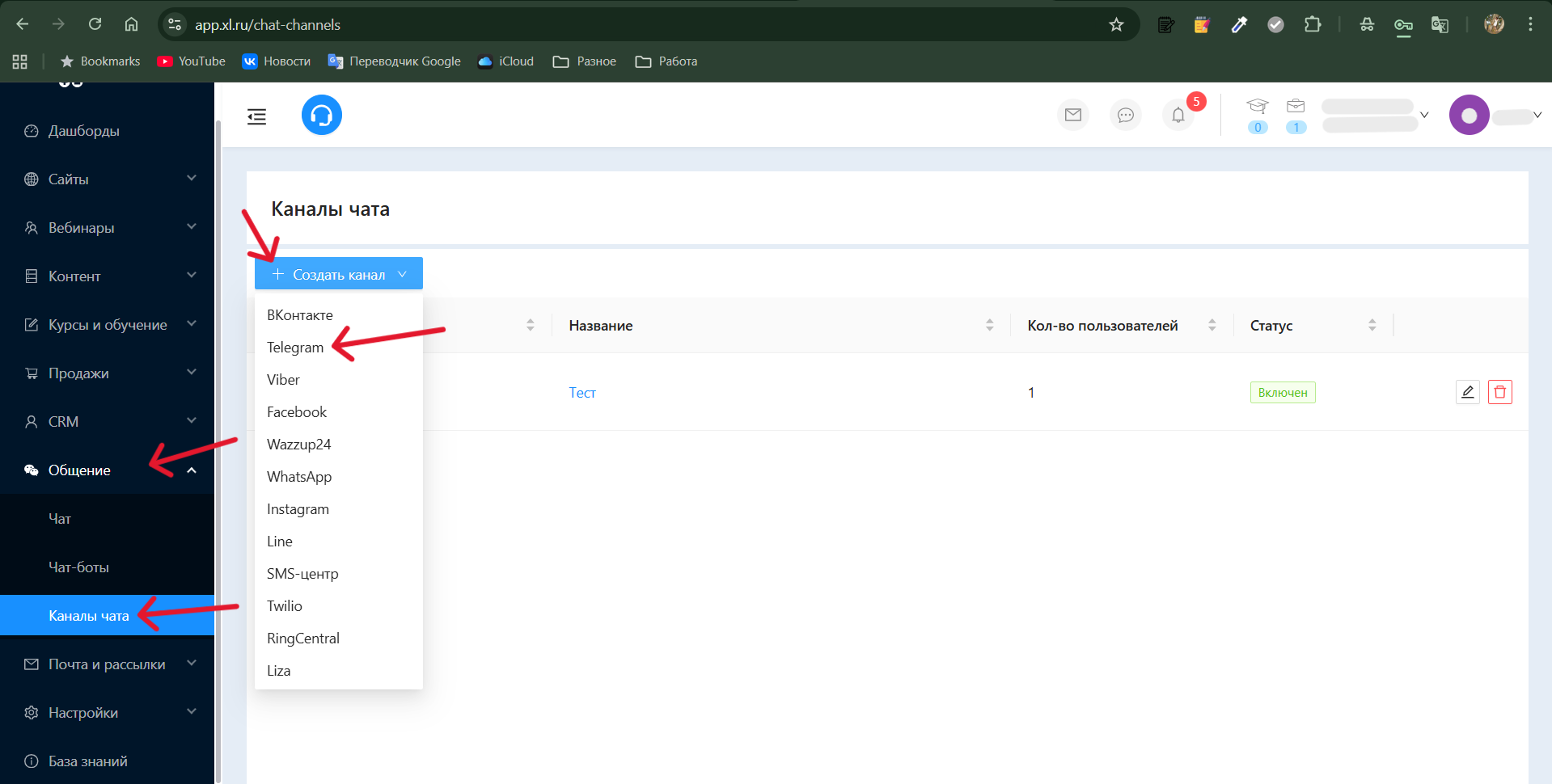 1. Перейдите в «Общение» ➡️ «Каналы чата» и нажмите кнопку «+ Создать канал». В выпадающем списке выберите Telegram
