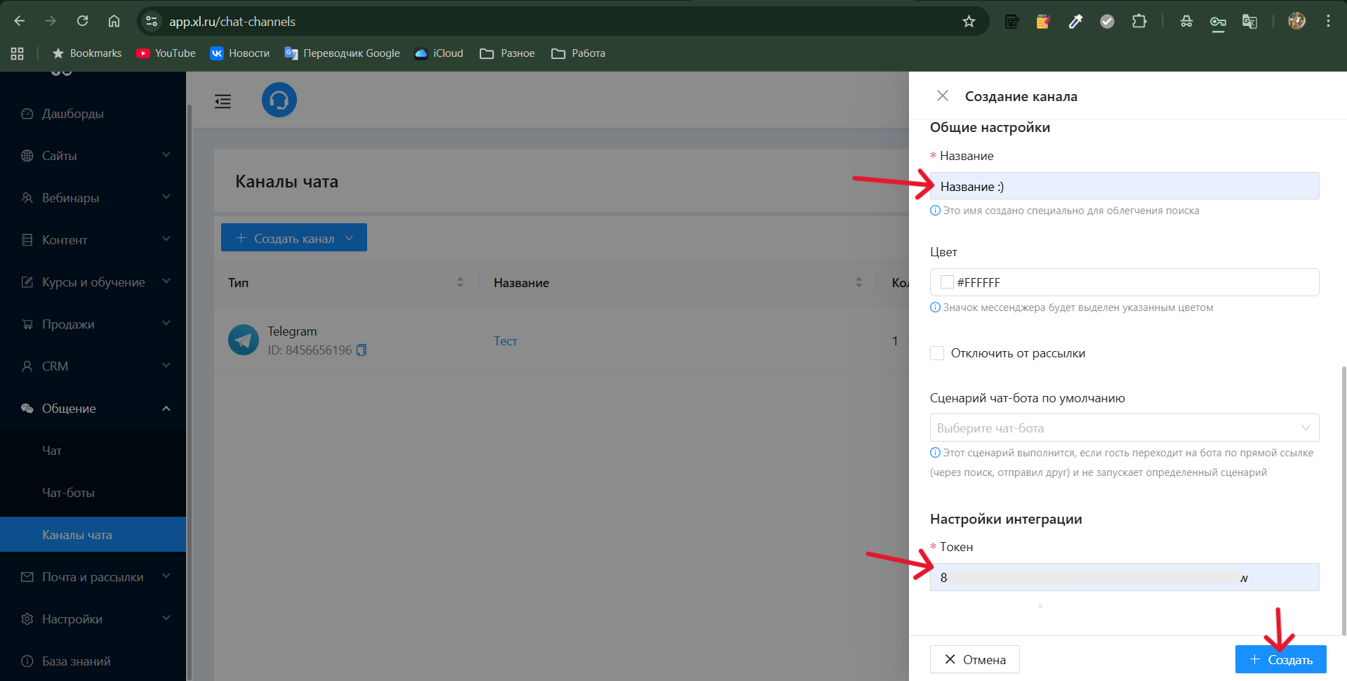 2. Введите название канала, токен бота из @BotFather и нажмите «+ Создать»