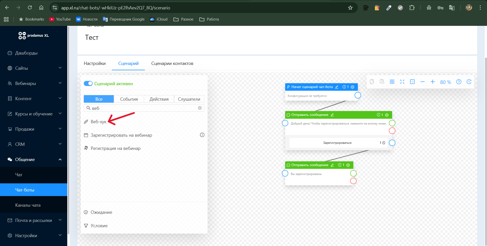 2. Откройте вкладку «Сценарий» и в нужном месте (например, после оплаты или регистрации) добавьте блок «Веб-хук».