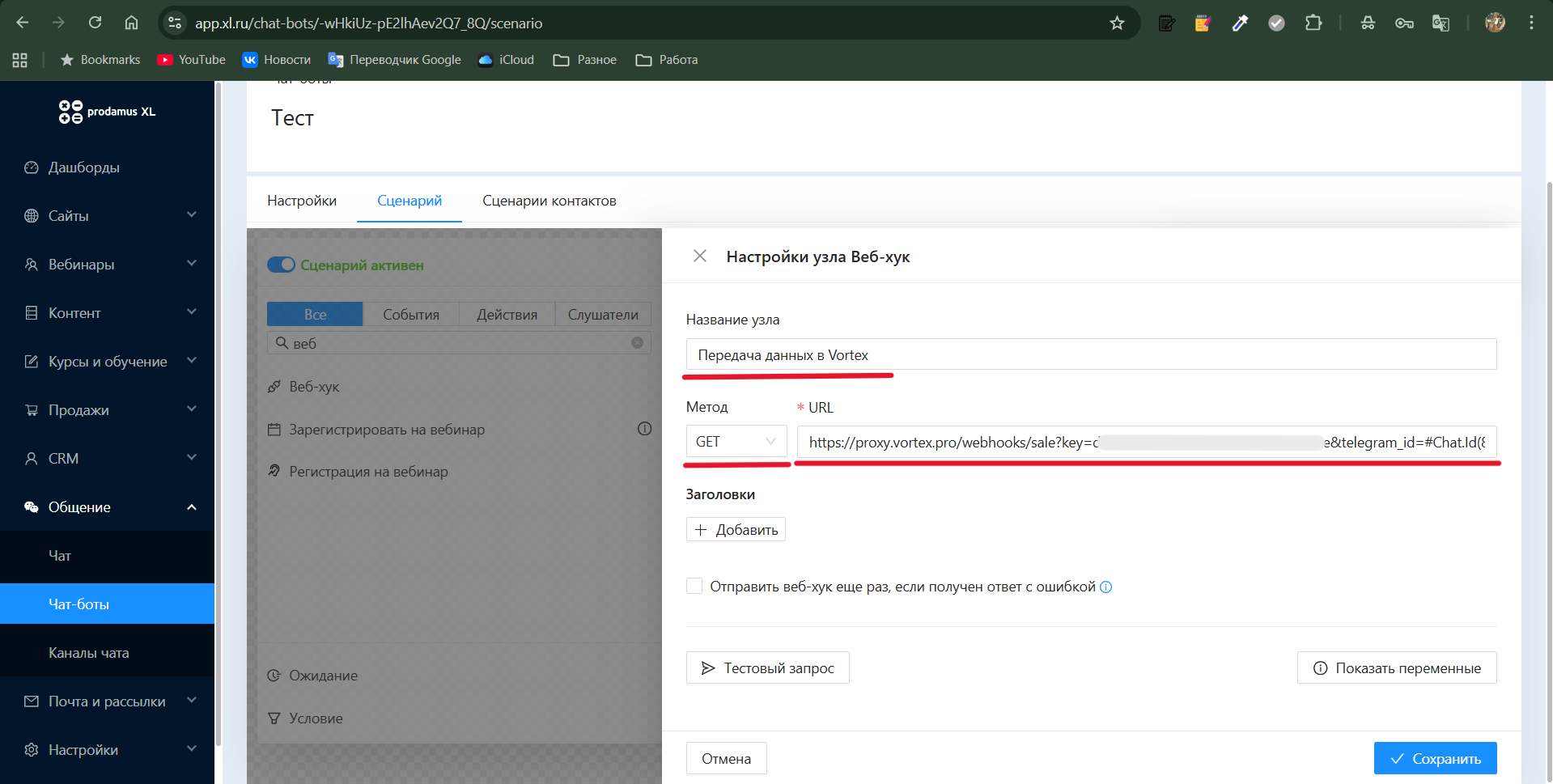 URL вебхука состоит из ключа вебхука и переменных. Чтобы данные корректно передались в Vortex, необходимо указать Telegram ID пользователя. Telegram ID передается в переменной #Chat.Id(ID канала)#.